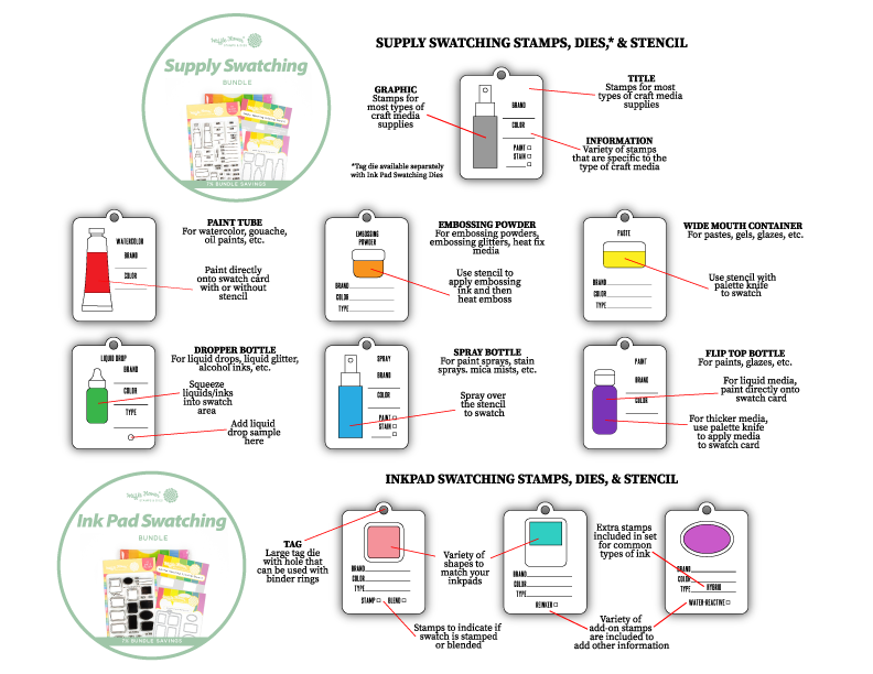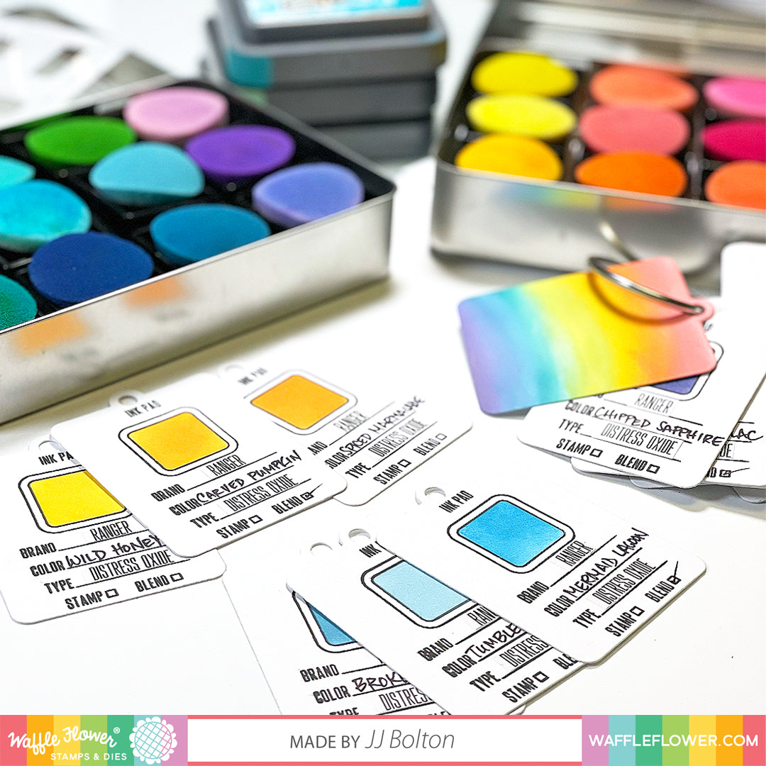 Organiza tu colección de tintas de forma creativa y funcional con este sistema de muestreo diseñado por artesanos para artesanos. El conjunto incluye sellos que replican las formas de tus almohadillas de tinta favoritas, permitiéndote crear muestras visuales únicas y organizadas. Además, cuenta con sellos adicionales para anotar información como marca, color y tipo de tinta. Personaliza tus muestras mezclando y combinando los sellos según tu colección. Perfecto para quienes aman mantener su material de craft bien catalogado y a la vista. Los sellos miden aproximadamente 1" de ancho x 1 3/16" de alto.
