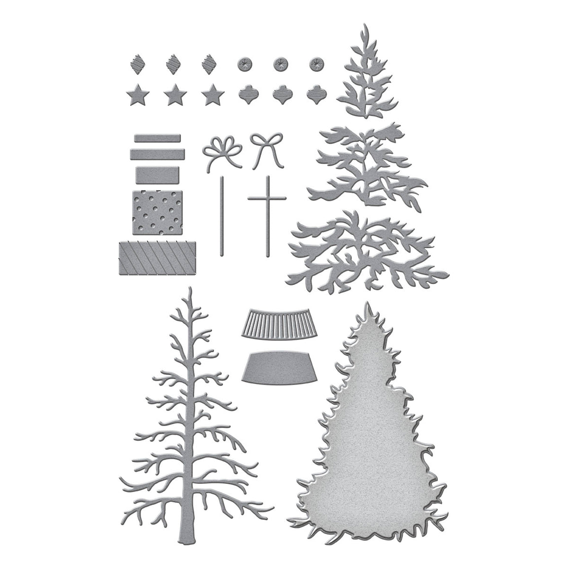 Classic Christmas Tree Etched Dies are from the Timeless Trees Collection by Simon Hurley. Cut and assembled, this set of 14 thin metal cutting dies creates a beautiful traditional Christmas tree with all the trimmings and a pile of gifts around its foot. Not one detail is missed, from the ornament shapes, the star topper, all the way to the bows on the gifts. Use different tones of green cardstock in the tree layers for more dimension and interest.